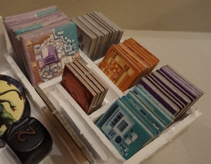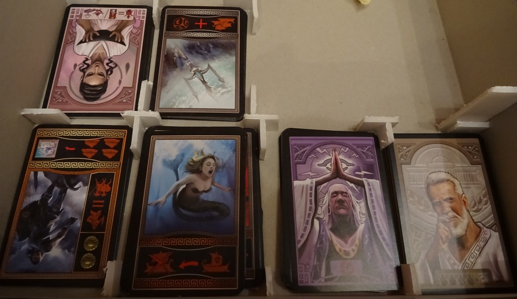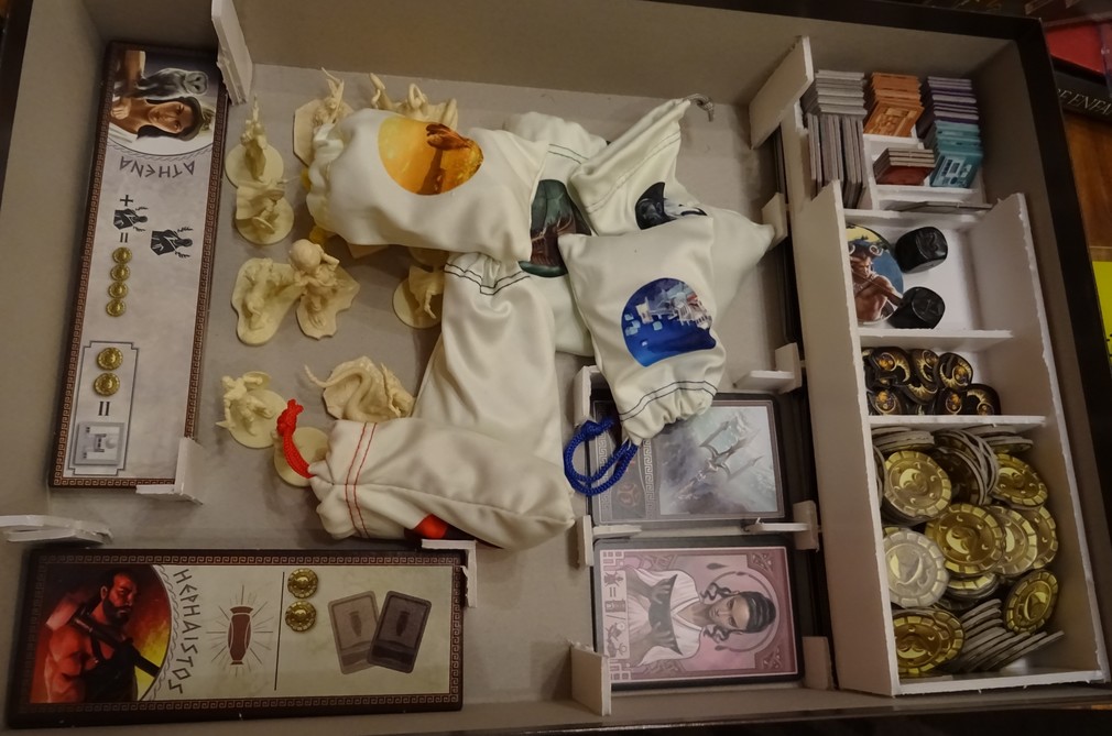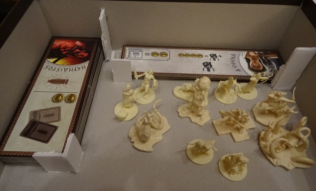 On peut aussi mettre dans les coins les tuiles dieux. Et faire un emplacement pour les héros/dieux, mais j’ai été fainéant ce coup-ci aussi, et je les laisse en vrac. On peut les chopper facilement de toute façon. Peut-être un jour si je les peints je ferai un truc. On verra dans le futur.