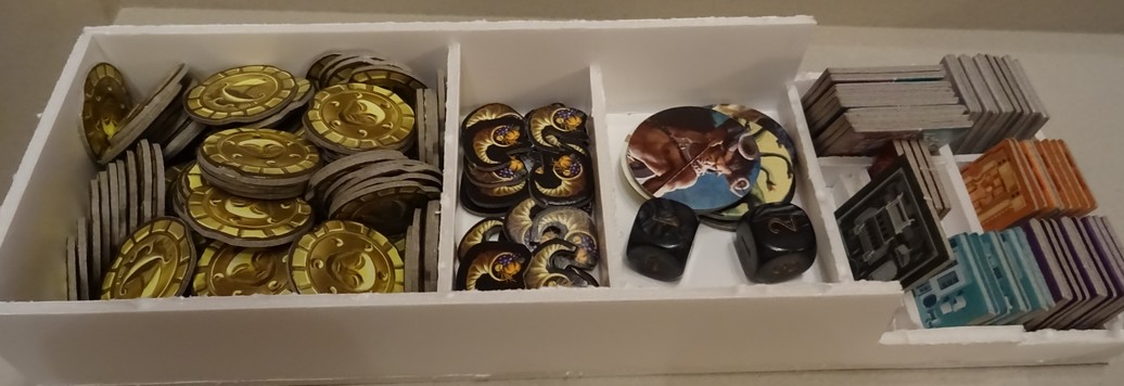 En fait, il n’y a pas grand chose de plus à faire. Il faut de toute façon sortir les cartes à chaque partie, et on peut les ranger un peu comme on veut. Néanmoins, une barquette avec les cornes d’abondances, la monnaie et les bâtiments, serait bien pratique. Or, si je veux que tout ne se balade pas dans la boîte, mais qu’elle ne soit pas trop profonde, il faudra la caler. Autant donc mettre les cartes au fond de la boîte et la barquette dessus.