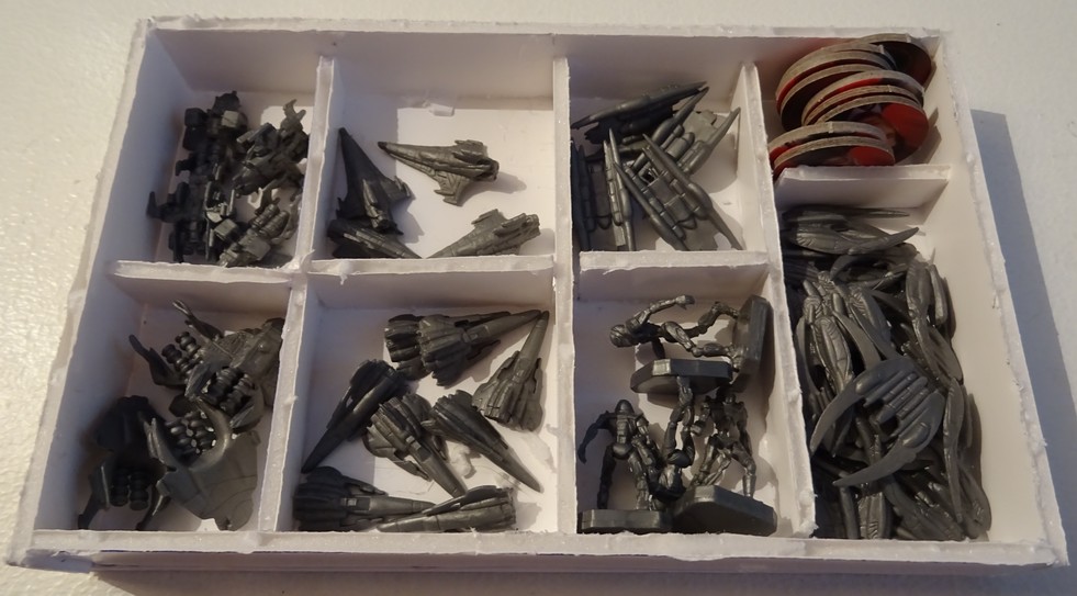 Hé mais avec ça j’ai déjà fait pas mal de chemin ! Il ne reste que les jetons personnages et les grandes cartes, youpee ! Pour les jetons personnages, je fais un grand bac profond à mettre à côté de la barquette vaisseau, de la même longueur que celle-ci. Hop, on met tout en vrac dedans, parce que je ne vois pas comment faire mieux.