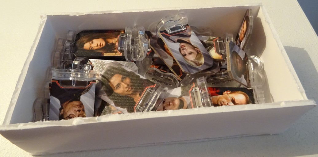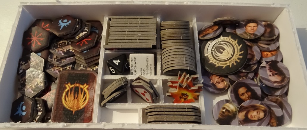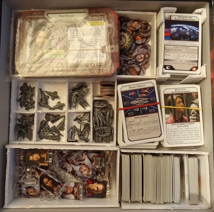 Voilà un peu le gros morceau du jour. D’abord parce que BSG, c’est du matériel en pagaille, et alors avec deux extensions, je vous dis pas. Enfin si je vous dis, je viens de le faire à l’instant. Les débuts de parties sont du coup un poil longs à mettre en place, surtout quand il faut chercher le matériel d’une extension ou d’une autre. En plus de cela, je n’ai pas acheté Pegasus, mais je ne désespère pas de le faire un jour. Et on va essayer de tout faire rentrer dans une boîte. Pfiou, ça me fatigue déjà.