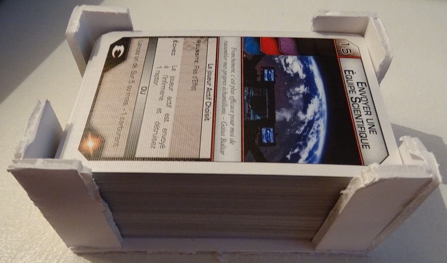 Bon, et prévoyez aussi de la marge. Pas mal de marge. Parce que chaque fois que vous rajouterez une séparation, vous laisserez probablement un peu d’espace juste pour être tranquille, même si vous ne prévoyez pas de rajouter des choses après. Et au final vous risquez d’avoir une barquette trop petite. À titre d’exemple, la pile des cartes rangées ici fait 6.7 cm, ma barquette en fait 12 (de façon à prendre toute la place laissée dans le prolongement de la barquette de vaisseaux). Je pensais être large, mais au final les derniers emplacements sont trop petits à mon goût…