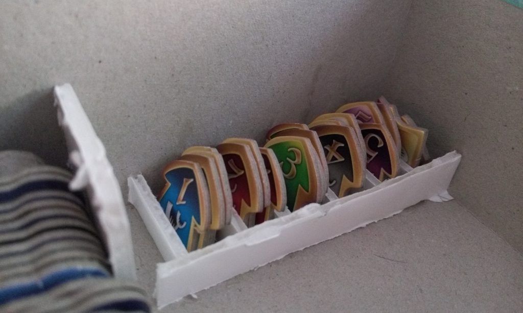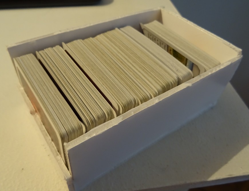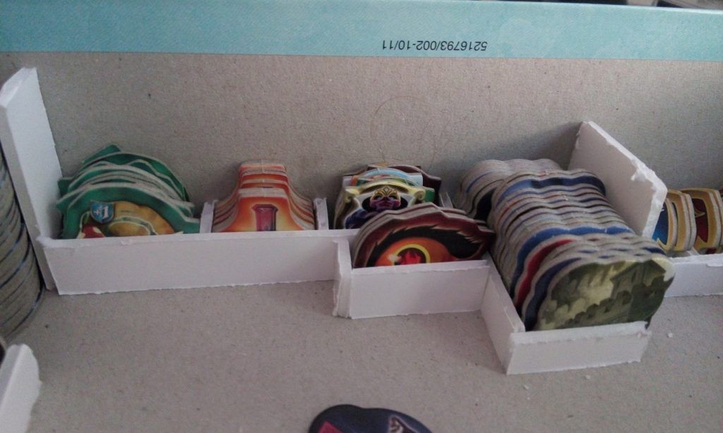 Ensuite, on reste dans le facile : un distributeur pour les petites cartes. Elles, elles rentrent sur la tranche. Il faut juste laisser un peu de place pour ajouter celles d’une possible extension. Et là, conseil : quand vous mesurez la longueur qu’il vous faut pour ce genre de barquettes, pensez à compter les épaisseurs du carton plume. Ici j’ai 6 séparateurs soit presque 2 cm de perdu. C’est énorme! (« 2 cm », « C’est énorme », je vous laisse faire la blague de votre choix dans votre tête tout seul comme des grands) (si vraiment elle est drôle/originale, postez là en commentaire).