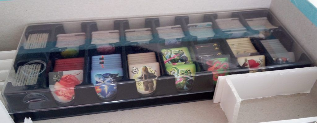 Première étape, voir si les cartes tiennent sur la tranche. On met tout les grands plateaux au fond… Et là c’est le drame, car elles dépassent ! Alors ça c’est un peu embêtant, cela veut dire qu’il faudra les ranger en piles. J’aime pas bien ça car ce n’est pas très pratique pour retrouver les cartes qu’on veut (il y en a plusieurs types) quand la boîte est bien remplie. Il faudra faire plusieurs étages, et on perd vite de la place rien qu’avec l’épaisseur du carton plume. Mais vous savez quoi, là je suis ne train de me plaindre au lieu de m’y mettre. Allez, on est pas là pour être ici : on se retrousse les manches et on s’y jette.