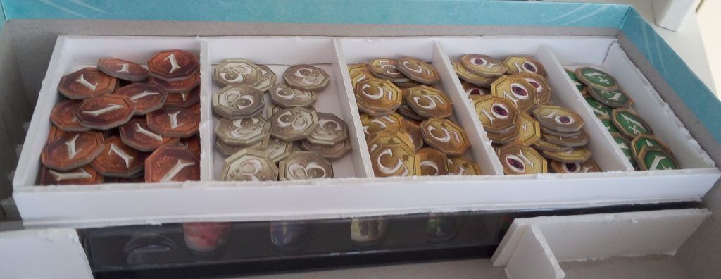 Ensuite, il me reste un bon paquet de jetons, je vais essayer de tous les faire tenir dans la même barquette, histoire qu’on la sorte une fois pour toute en début de partie et paf, c’est prêt.
