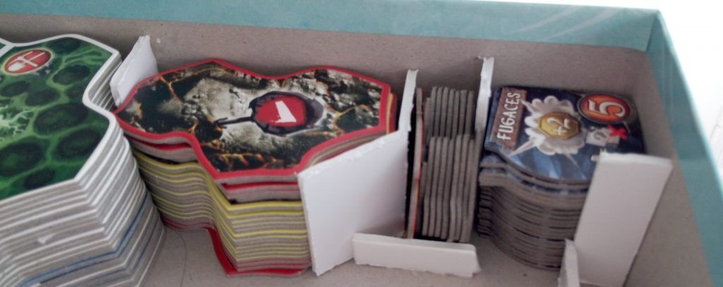 Bon, il me reste plein de place, je vais donc pouvoir ranger les multiples pions du jeu quelque part. La logique voudrait que je les mette dans une barquette, pour qu’on puisse les avoir sur la table pendant la partie. Mais comme la logique c’est pour les nazes, je vais plutôt les mettre dans des emplacements au fond de la boîte, histoire que ce soit bien pas pratique. Et puis tant qu’à être idiot, on va y aller à fond, et faire en sorte que les pions en questions ne tiennent pas quand on range la boîte verticale, ce qui est le cas dans mon étagère…