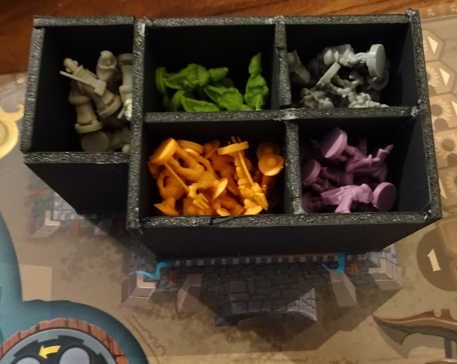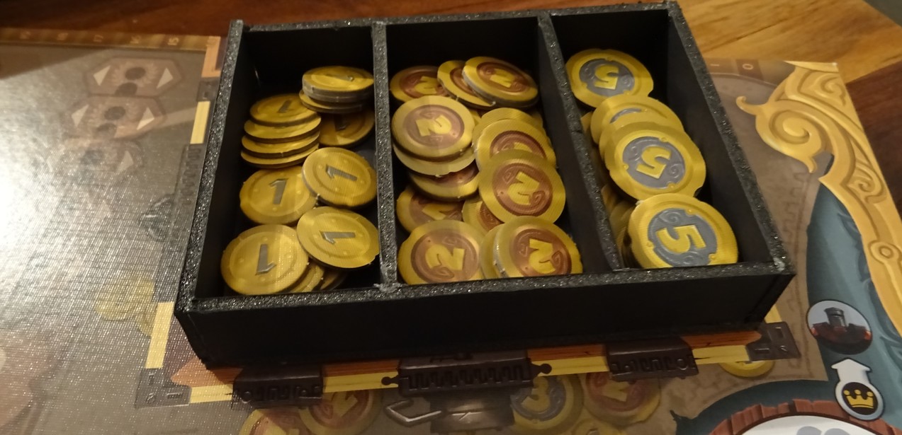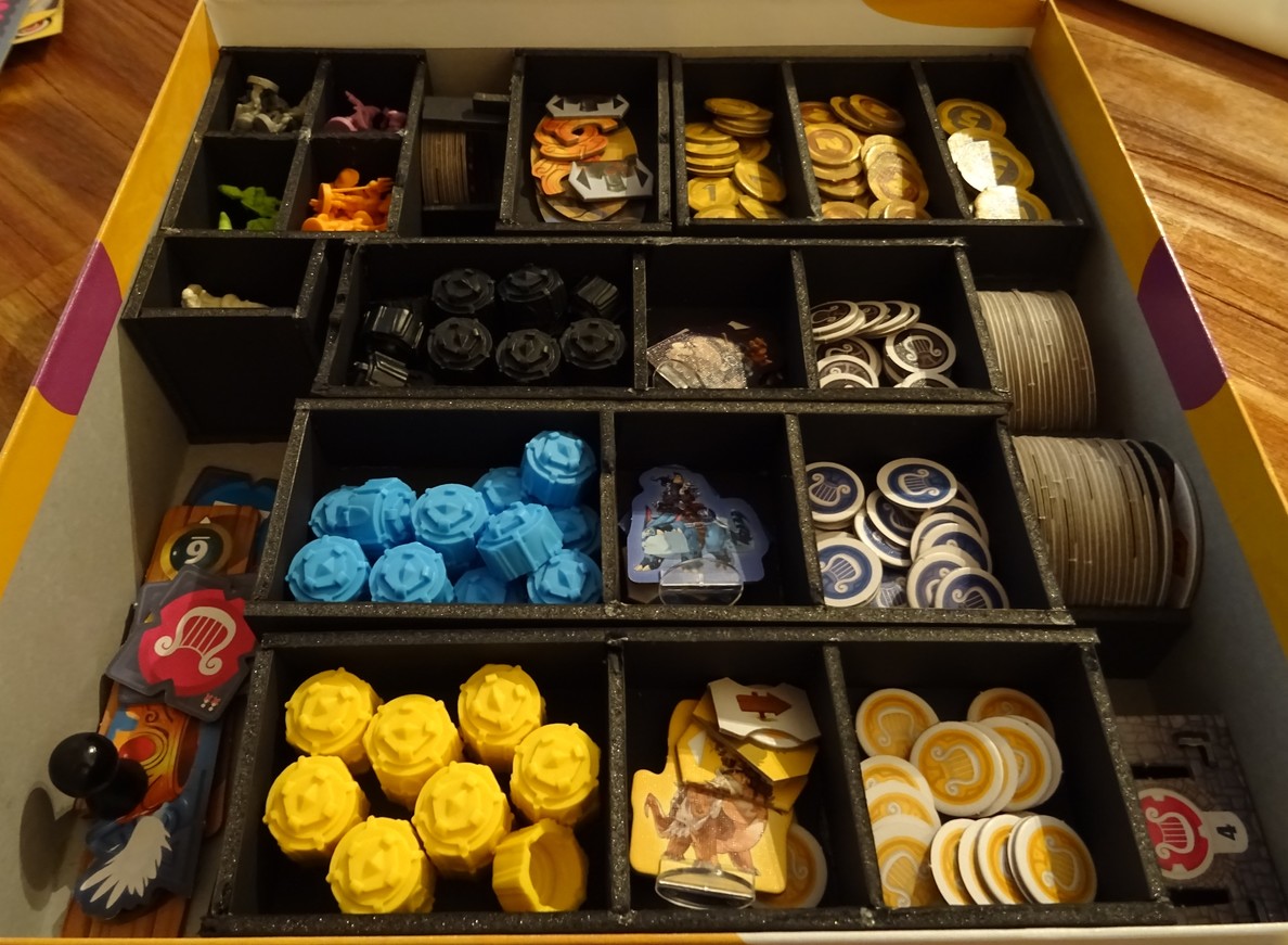 Et comme la barquette à pépètes est plus courte que les cadrants, j’ai la place de faire une barquette pour le matériel du jeu à deux joueurs, avec un petit un bitoniau pour caler les jetons colosses.