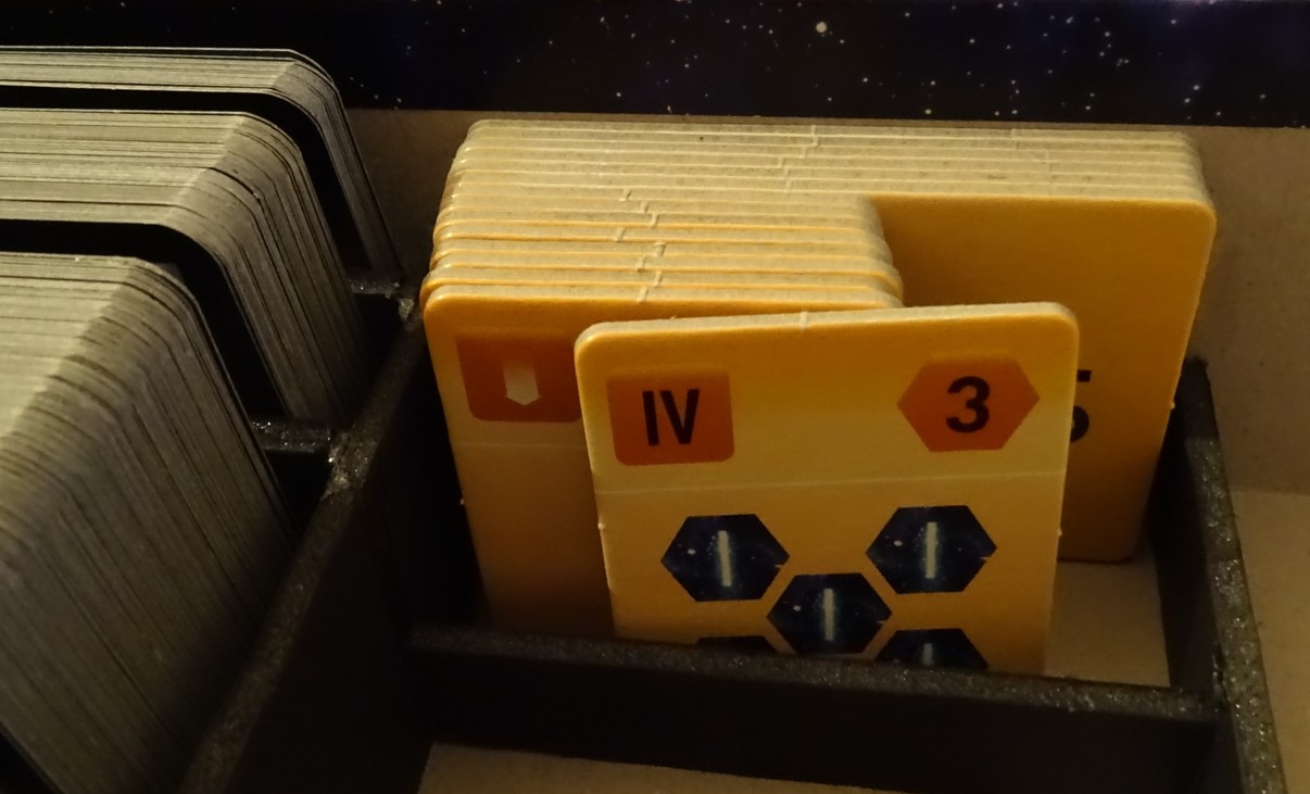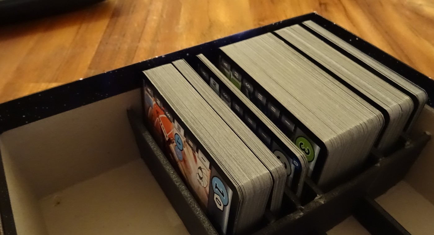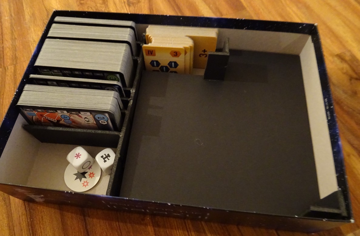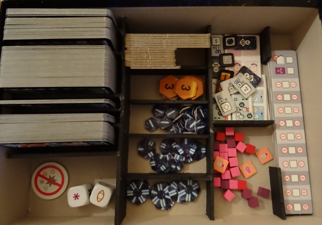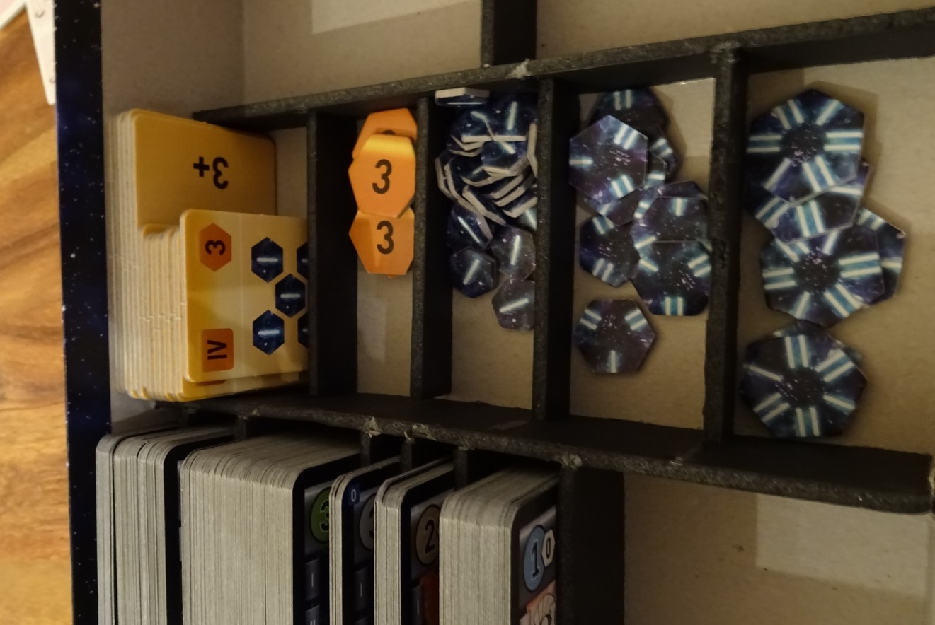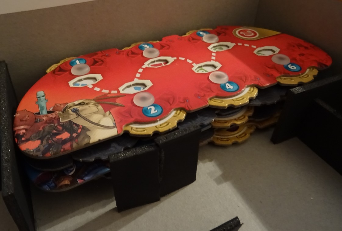 Allez on va faire simple (et efficace bien sûr !) : un emplacement pour les tuiles du mode solo, un autre pour les cubes de la partie baston, et un pour les réglettes et paf, c’est fini ! Bon, les dés sont top grands, mais si je les mets devant les cartes, on est bien.