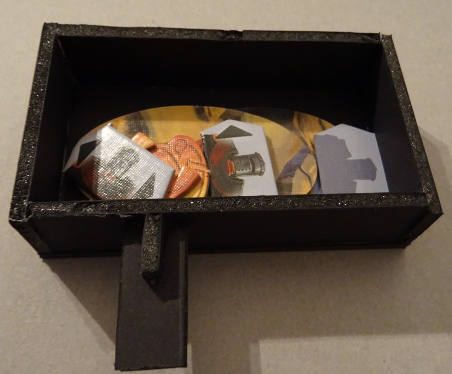 Pour les cartes objets, un petit rangement à côté des cartes visions et c’est top. Je peux même mettre les supports de l’horloge.