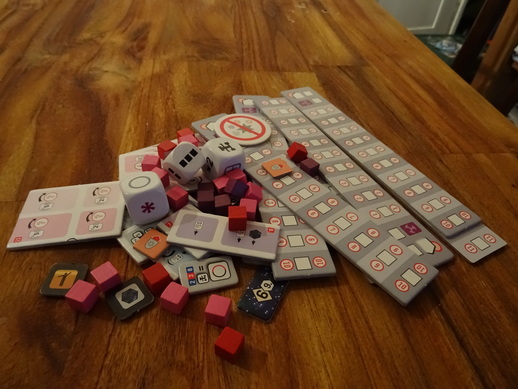 Bon allez, c’est parti pour une lecture des règles pour comprendre ce que c’est. Et je peux vous dire que c’est pas une sinécure. Vache ! Qu’il est horrible à lire ce livret de règles. Bon alors, déjà voilà il y a des réglettes et des petits cubes pour la partie baston, et du matos pour le mode solo.