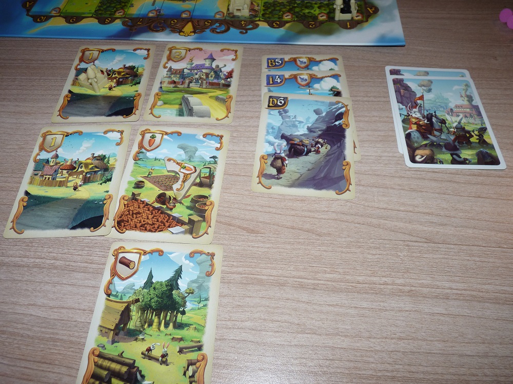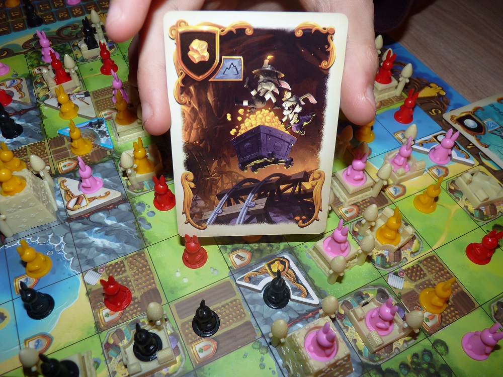 On y trouve des jolies petites figurines de lapins (oui, je sais, je risque d’évoquer souvent ces petits mammifères) de quatre couleurs différentes (quelle désillusion de ne pas y voir de vert), des figurines de forteresses (ornées de une, deux ou trois tours), une poignée de jetons, et un énorme paquet de cartes (182 au total, excusez du peu).