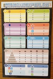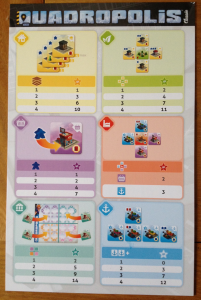 Une aide de jeu résume de façon claire les différents scoring des bâtiments (sauf pour les ports : on compte la colonne et la ligne la plus longue si bien que si une colonne et une ligne sont présentes, on compte bien les deux – et non la plus grande des deux).