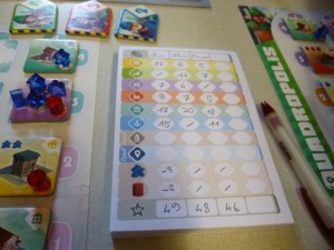 Scoring de la partie d’initiation sur le bloc-notes épais ! Je gagne sur le fil malgré mes malus.