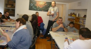 1- Une explication collective des règles, tout le monde suspendu aux paroles du maître d’école, joliment improvisé par Dom, employé et animateur du magasin ! Ah si les cours étaient tous aussi ludiques, il y aurait moins d’élèves partant en école buissonnière !