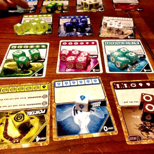 En gros : une sorte de dominion-like version dés qui roulent_et_amassent_ la_mousse_en_forme_de_victoire, le tout avec pas mal d'interaction.