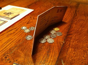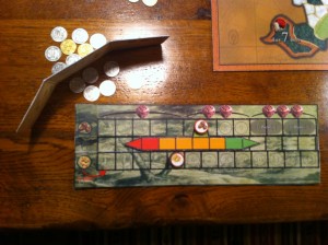 Première constatation, le jeu emploie beaucoup de matériel. On compte un gros plateau central, deux petits plateaux auxiliaires qui servent de supports de cartes, un plateau personnel et un paravent par joueur, trois types de cartes, trois types de dés, des points de victoire sous forme de pièces, une pile de marqueurs de nourriture, une poignée de compteurs et pions divers et variés. Sans atteindre les records d’un Twilight Imperium ou d’un Andor, on se retrouve avec une table plutôt chargée pour un jeu d’une heure et demie. La mise en place est en conséquence. Il faut mettre à sa place tout ce matos : préparer les pioches de carte, placer les jetons de nourriture et les villages aléatoirement sur le plateau et donner à chaque joueur ce dont il a besoin pour jouer.