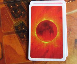 Sur la droite du plateau, un marqueur monte et descend selon l’apparition de certains icônes en jeu. D’autant plus fort vers le bas qu’on a laissé des monstres sur la plateau. Encore plus fort si il y a parmi eux des Seigneurs. Si le marqueur atteint le bas de l’échelle, la partie est perdue. L’éclipse annonce l’ouverture du portail par les forces du mal. Terminé.
