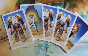 Petit à petit on finit par mieux maîtriser le rythme. On connaît mieux les cartes. Le monde d’Astéros est découpé en trois régions chacune représentée par une pile (I, II, III). On finit par en connaître la composition par cœur et on sait un peu mieux où chercher telle ou telle carte Relique (obtenues en gagnant un combat contre un seigneur, toujours lié à la même zone de jeu).
