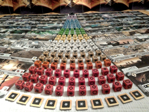 Les aficonados de RFTG ont probablement déjà lu l’incontournable review de mister TSR sur le jeu de base et se frotteront les mains à la venue d’Ambition qui rajoute 14 nouvelles factions et 7 nouveaux mondes de départ, ainsi que 2 nouveaux types de dés (leaders et entrepreneurs) pour une belle diversité dans le choix des actions. Chaque joueur se voit attribuer ainsi d’un dé noir à la place d’un dé blanc. Ce dé noir offre 2 symboles d’action sur chaque face, autrement dit, plein de nouvelles options qui vous permettront de remplir plus rapidement vos objectifs. Et oui, une extension qui diminue potentiellement le temps de jeu, c’est pas si courant !