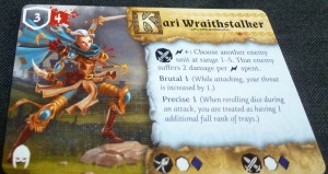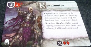 - En haut à gauche, la défense et les points de vie de chaque figurine de l’ensemble : les réanimés ont un de défense et un de vie pour chaque figurine de l’unité. Juliette (Kari Wraithstalker de son vrai nom) a 3 de défense et quatre points de vie. Elle est donc beaucoup plus solide, mais moins nombreuse sur son socle, puisqu’elle est seule. N’est-ce pas.