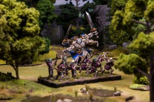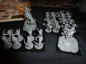 Côté Morts Vivants, on va trouver : une espèce de scolopendre chevauchée (ou plutôt « scolopendrée ») d’un squelette, une brute épaisse (appelons-le Roméo, je ne connais plus son nom), huit archers squelettes groupés sur des socles par quatre et seize guerriers réanimés eux aussi groupés par quatre sur des socles.