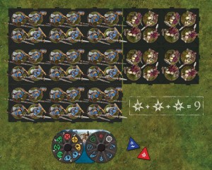 Vous me direz, pour une unité qui n’en jette que deux, à quoi cela sert-il ? Je n’en sais trop rien, si ce n’est qu’une attaque de flanc permet de jeter un dé supplémentaire (sauf erreur de ma part). Revenons à l’exemple ci-dessus : les piquiers infligent donc les deux dégâts figurant sur les dés, plus le dégât présent sur le diagramme de modification, multipliés par trois car ils ont trois socles de front, soit un total de 9 dégâts. Ce nombre de dégâts est à diviser par la valeur de défense de l’unité attaquée, ici 1. Cela fait donc 9 dégâts, et 9 unités retirées. Oui, les attaques sont particulièrement violentes… Nous nous éloignons ici passablement du système de combat d’X-Wing où on jette des dés pour la défense, où plusieurs modificateurs existent, où la règle du nombre de socles n’existe pas.