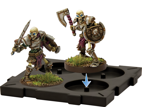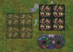 Comme je l’esquisse ci-dessus, les figurines sont placées sur des socles faisant environ 5 x 5 cm2, mais c’est sans doute très approximatif, car je n’ai pas le compas dans l’œil (j’ai essayé, c’est très douloureux). Ces socles peuvent eux-mêmes se lier entre eux, de façon à regrouper 16 figurines en un seul ensemble bougeant en même temps. En fait, on peut même regrouper beaucoup plus de socles, mais ce n’est pas faisable avec une seule boîte de base et sans extension.