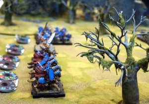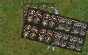 Sur la photo ci-dessus, l’unité de piquiers comporte 3 socles sur 3 socles. Les trois socles de front permettent de multiplier par trois le nombre de dégâts. Les trois socles en profondeur permettent de rejeter, si mes souvenirs sont bons, jusqu’à 3 dés.