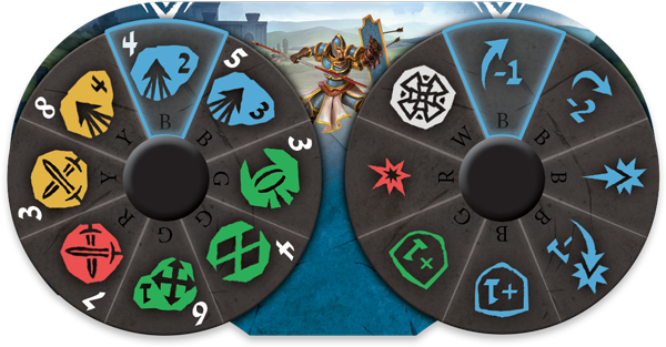 Celui de gauche est le diagramme d’action. Celui de droite, de modification. Par là, il faut entendre que le choix du diagramme de droite modifie le choix du diagramme de gauche. Dans l’exemple ci-dessus, le joueur a fait le choix sur le diagramme de gauche d’avancer de deux mais, sur le diagramme de droite, de tourner, ce qui a comme conséquence de le ralentir (-1).