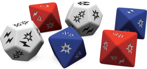 D’autres symboles existent sur les dés, par exemple des zigouigouis (terme très technique désignant les petits éclairs) qui peuvent déclencher des pouvoirs divers pour certaines unités : par exemple, Juliette inflige lors d’une attaque au corps à corps deux dégâts par zigouigouis obtenus à une unité distante. Autant dire qu’elle fait des étincelles.