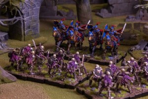 Côté Humains, nous avons : quatre cavaliers groupés par deux, seize piquiers groupés par quatre, une super combattante (appelons-la Juliette) et un golem. Soit donc, de chaque côté, deux figurines occupant un socle entier et 20 à 24 petites figurines.