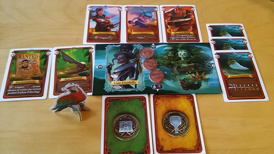Cela peut paraître simple comme bonjour, mais l’affaire demande deux précisions. Il ne peut y avoir plus de trois cartes par lot (si un lot à 3 cartes est refusé, on place des doublons (des points de victoire) sur la carte. Ensuite, on peut voir le type de chaque carte au dos de celle-ci. Rouge pour les pirates, vert pour les objets, bleu pour les reliques et jaune pour le rhum, avec des pictogrammes qui vont bien.