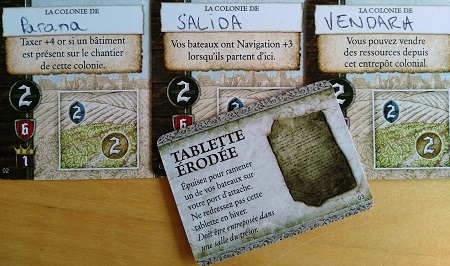 Pendant que les navires concordiens sillonnent les mers à la recherche de parchemins relatant l’expansion et l’extinction des civilisation de jadis, Forecaster et Torresueños établissent tous deux une colonie. Ces villégiatures plaisent : on s’y sentira à l’abri, on y déposera marchandises et y installera des plantations d’épices. Ah, l’épice, on voit déjà les nobliaux se perdre dans ses vapeurs, des prophètes naître d’en avoir trop consommé. Heureusement qu’elle se fait rare : autrement, s’il était aussi facile d’en consommer qu’un pichet de vin, plus personne ne pourrait travailler, trop embrumé.