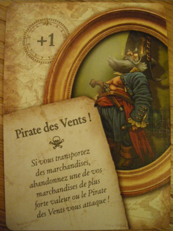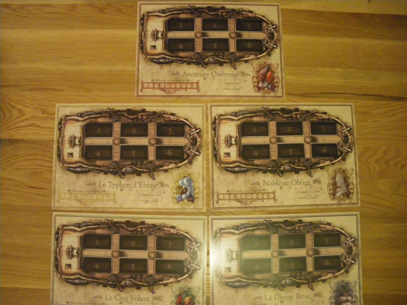 Quand vous préparez votre popotte, vous prenez donc une fiche vaisseau, votre buste figurine, 3 dés à votre couleur, 20 piastres de la Guilde (des piecettes en carton), 1 carte équipage Matelot (à placer sur la cale 4, 5 ou 6 de votre Vaisseau)…