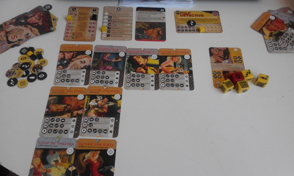 Pulp Detective affiche une base classique de gestion de cartes inhérente au jeu solo : réunir des symboles pour activer un pouvoir, piocher les cartes, les disposer selon un certain protocole avec une once de liberté néanmoins (ici on peut placer sa carte sur la première, deuxième ou troisième ligne de pose). On se fait aider par ses pouvoirs, on gère son énergie, on fait le choix de suivre telle ou telle piste en choisissant C/I/S, on tente de récupérer un objet… Le thème parvient, à travers ses symboles, illustrations et petites phrases chocs, à créer l’ambiance.