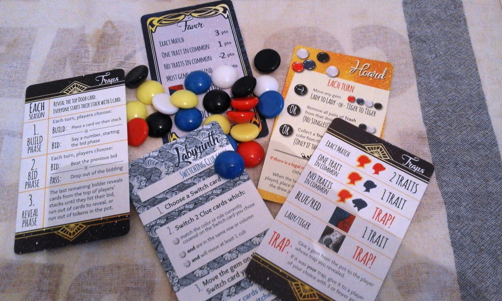LABYRINTH – déplacement à 2 : un carré de 3×3 que vous devrez traverser pour amener vos gemmes d’une extrémité à l’autre (coin haut droit à coin bas gauche). 2 actions par tour : déplacer vos gemmes ou échanger les cartes. Blocage, anticipation et les erreurs de l’adversaire pour y parvenir. Bien vu.