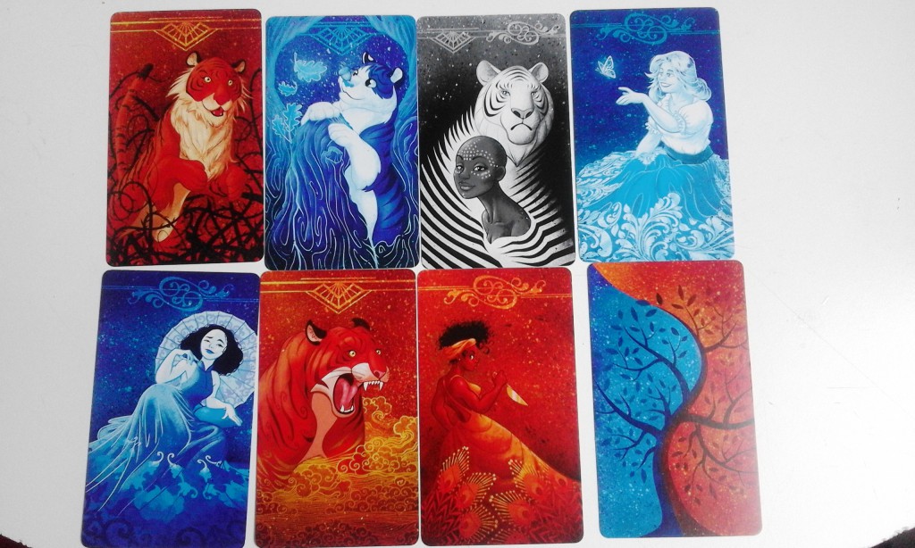 Petite boîte colorée aux allures de Walt Disney qui tient dans la poche, ce tigre et sa demoiselle vous propose non pas 1, non pas 2 mais 5 jeux au travers de 18 cartes magnifiquement illustrées et une poignée de gemmes chatoyantes. 18 cartes et des aides de jeu à l’effigie de la jeune fille ou du tigre, sans oublier deux cartes neutres pouvant servir de « spéciales » suivant le jeu.