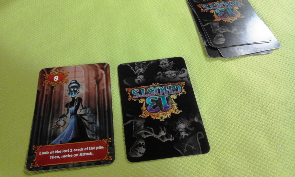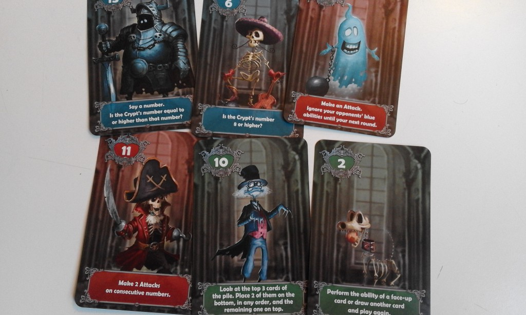 L’une d’elles, face cachée, sera soit la crypte, soit la cachette du fantôme. Les cartes ont des valeurs de 1 à 13. Admettons que je cache la carte momie valeur 9. Ma deuxième carte (fillette valeur 5) va me servir à glaner des indices. Je la joue face visible et lis le texte : « ta crypte est-elle du numéro 1, 2, 3, 4 ? » . Si la réponse est oui, je sais maintenant où taper, si j’ai en main une de ces 4 valeurs, cela réduit le champ des possibles. Mais, en posant mon 5 je donne aussi un indice à mon adversaire : ma crypte n’est pas de valeur 5. Certaines cartes permettent de regarder 2 ou 3 cartes de la pioche (c’est plutôt puissant si vous arrivez à retenir les chiffres).