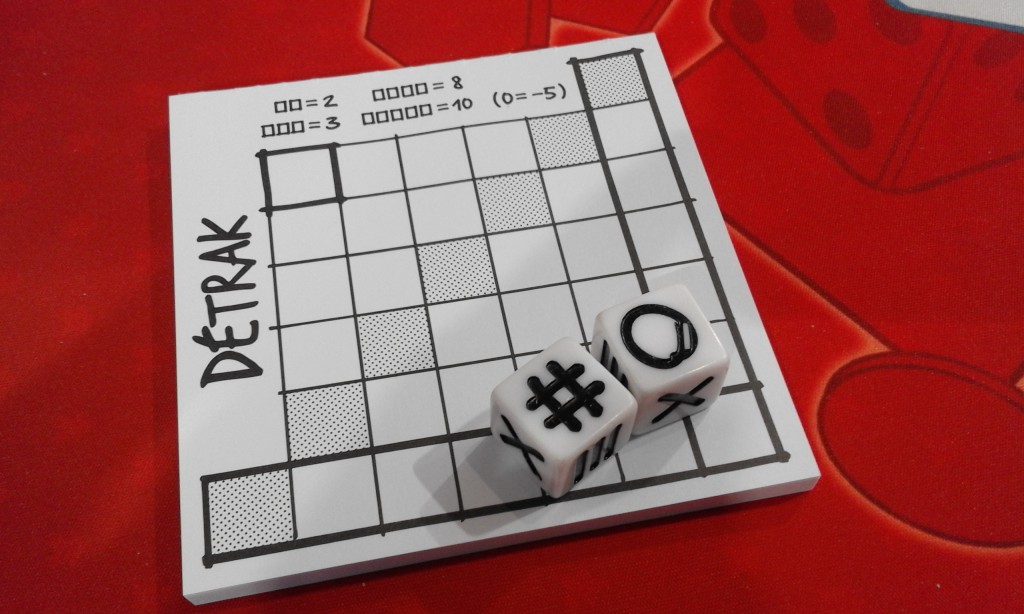 Lancez les dés et placez un des deux symboles sur votre grille. Relancez les dés, la partie commence : placez les symboles sur votre grille. Le but est de faire des colonnes ou des lignes avec des formes identiques pour scorer (2 = 2 points /4 = 8 etc). Vous devez utilisez les deux dés. La contrainte étant que vous devez placer vos deux formes de façon adjacente : en touchant un symbole déjà présent sur la grille ou en collant les deux au milieu de votre grille si vous voulez. Peu à peu l’espace va se restreindre. La partie se termine lorsque la grille est remplie ou si vous ne pouvez plus rien écrire.