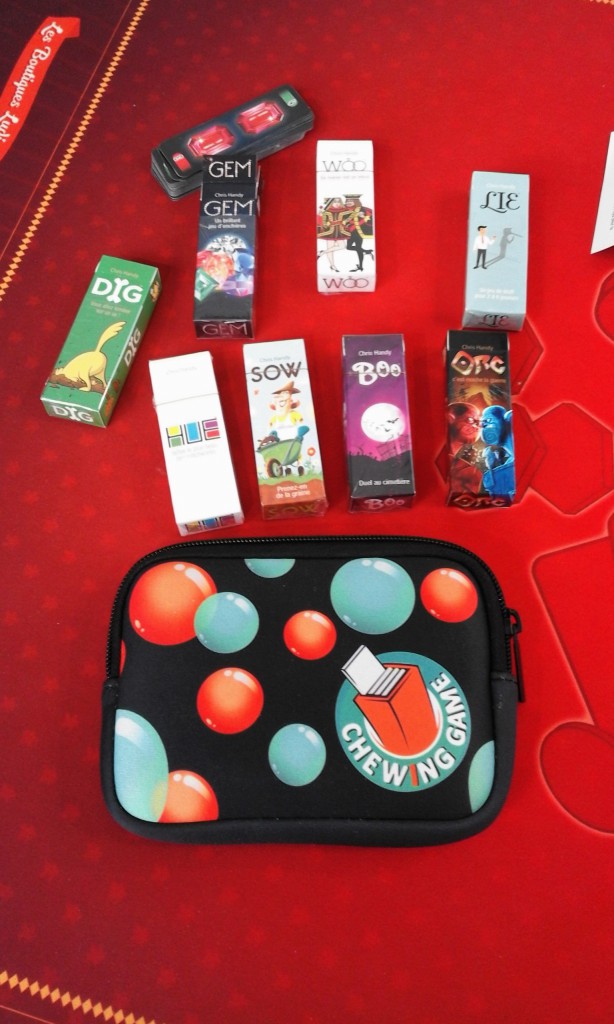 S’arrêter dans une boutique de jeux où le taulier aime son boulot est toujours source de découvertes. On parle un moment de tel auteur, on s’indigne sur tel produit et on garde le meilleur pour la fin. Le meilleur, ici, c’est cette pochette (un peu moche) de Chewing Game contenant 8 nano jeux signés Chris Handy. La grosse surprise de ces jeux : ils ne sont pas plus grands qu’un paquet de chewing gum et sont vendus autour de 5 euros. Autant dire que cette rubrique leur tend les bras pour des hugs à la chaine.