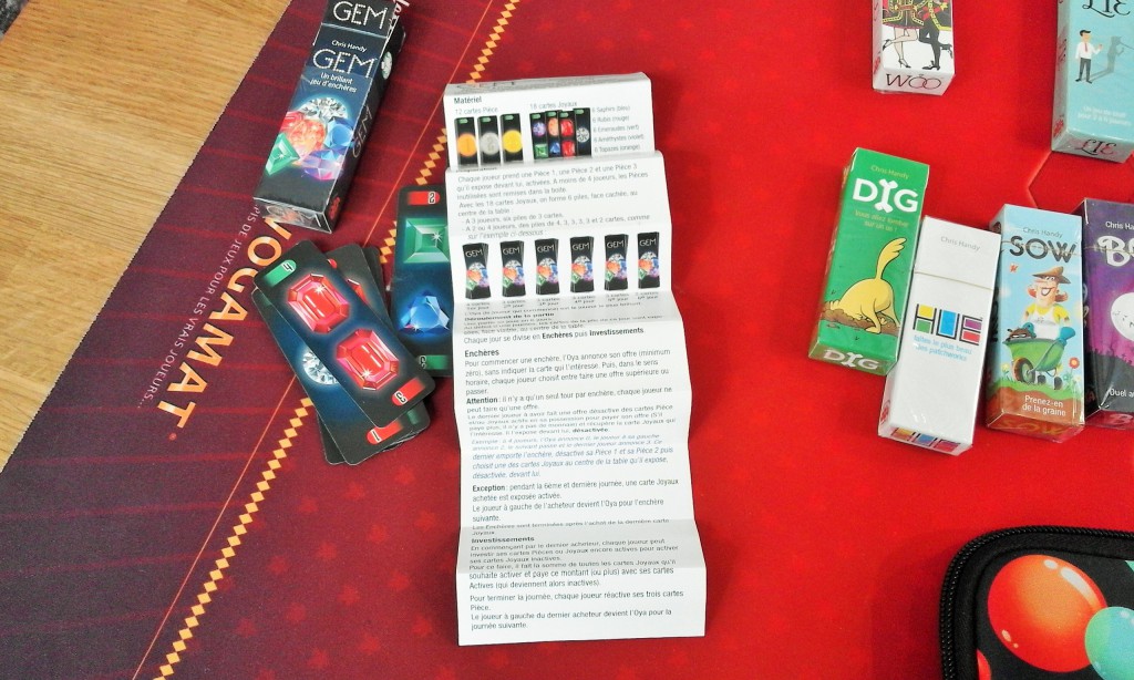 Lies par exemple est un Perudo sous forme de cartes (exit les dés et les gobelets donc), il faudra parier sur les valeurs que vous pensez disponibles. Gem est un jeu d’enchères où on achètera… des gemmes ! La valeur de ces dernières étant symbolisée par des petits rectangles de couleur que l’on fera apparaître en pivotant sa carte. Hue rappellera Marrakech puisqu’il faut créer des zones de couleurs quitte à recouvrir l’adversaire. (Je parle ici de cartes mais il s’agit plutôt de languettes, matériel allongé pour tenir dans son étui étiré).