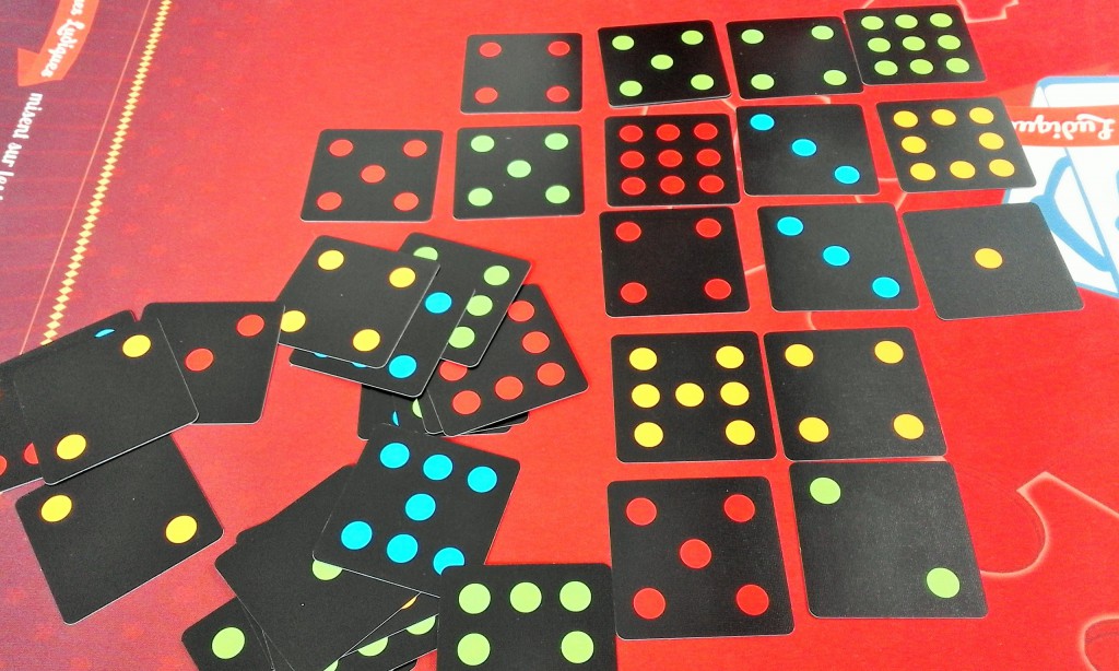 Dans cette boite, 72 cartes carrées de 4 couleurs (valeur 1-9) pour jouer de 2 à 4. Quelle que soit la configuration, chaque joueur se verra remettre une couleur. Son but : aligner 4 cartes (5 à deux) de sa couleur horizontalement, verticalement ou en diagonale, le tout devant tenir dans un carré de 6 x6 que nous allons créer à chaque tour.