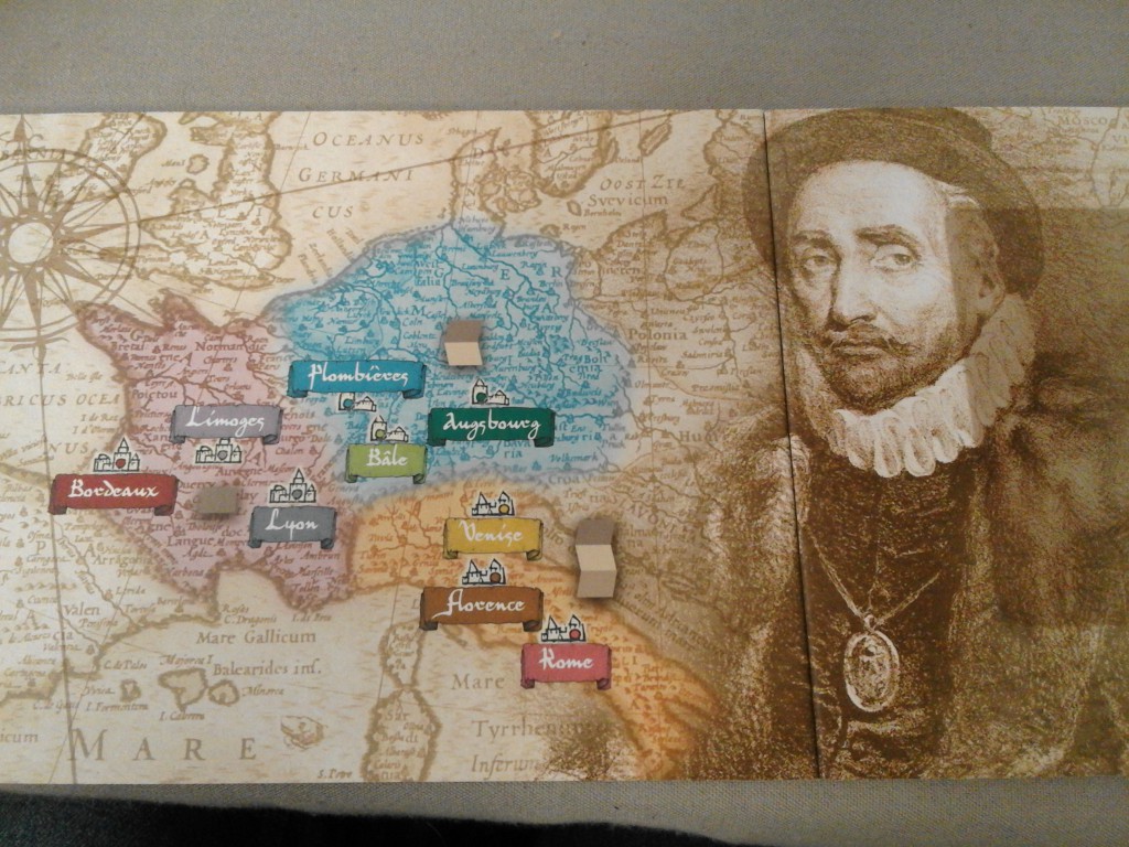 Voyages avec Montaigne est donc un jeu de collection habile qui change dans sa façon de procéder, surtout en imposant des contraintes sur l’espace de mobilité (et donc vos possibilités) qui rétrécit au cours de la partie (il est passé par ici, il ne peut plus passer par là…).