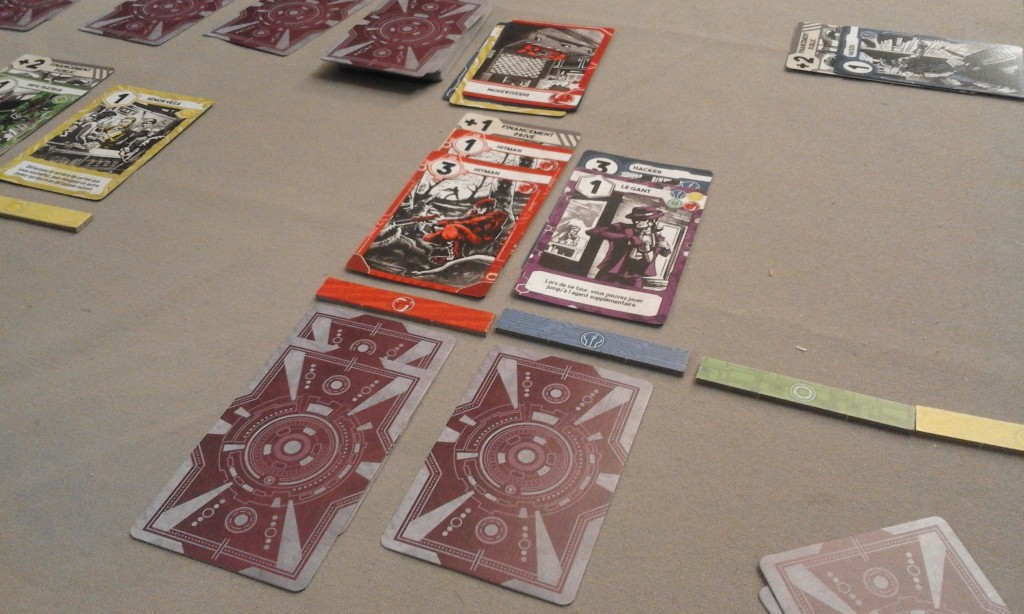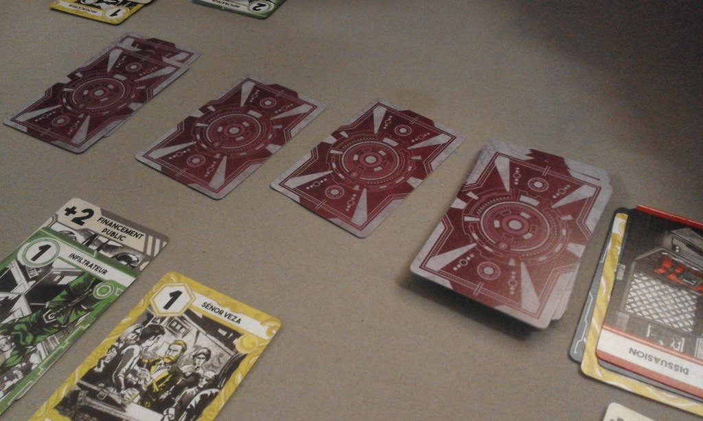 Le jeu comprend un marché de 3 cartes face cachée où, à chaque tour, on pourra prendre une carte. Si la carte n’est pas choisie, on la repose et on en rajoute une autre et on passe à la suivante. Le prochain aura donc deux cartes s’il prend le tas, etc. Ces cartes seront des espions, des agents spéciaux, des missions… tout ce dont vous aurez besoin pour asseoir votre suprématie.