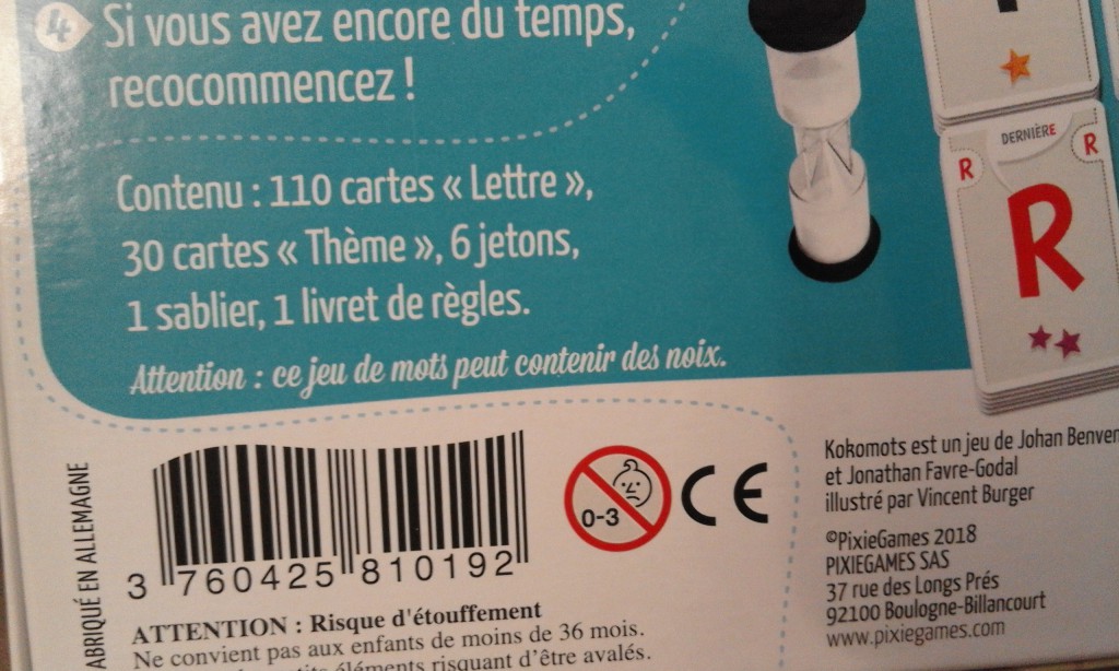 Pour ceux qui aiment les jeux de mots ou d’associations de mots, celui là pourra rejoindre Cogit ou Chrono-mots sur votre étagère. Il évolue avec le même esprit. Le jeu permet par moment de dérouler les propositions à la vitesse supersonique et parfois d’être totalement bloqué « aagueueugeuueuu… ». Ne vous attendez pas à faire des mots contenant vos 5 lettres, pas que ce soit impossible, mais la contrainte du temps pousse à penser simple et basique. Les contraintes (première lettre…) sont le petit plus qui rend le jeu attractif, sans elles, il manquerait clairement quelque chose. Plus simple que Chrono-mots (trop simple diront certains), KoKomots est un jeu tendu, fluide et familial qui fait très bien ce qu’on attend de lui (si on ne lui en demande pas trop).