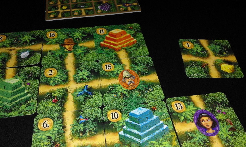 Un jeu où l’on doit mener son explorateur au temple qui lui correspond. Chaque joueur possède les mêmes tuiles chemin, joue le même numéro de tuile au même moment, la plaçant sur son plateau personnel, là où il le souhaite.