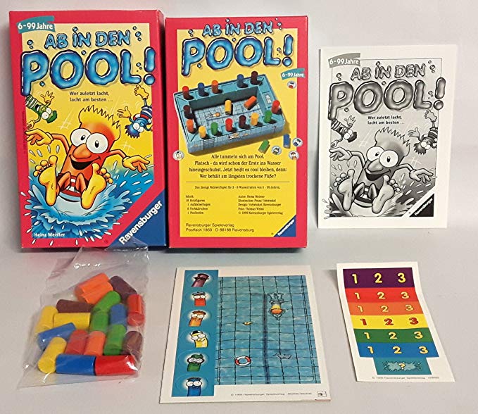 Réédition de Ab den Pool (1999), ce jeu un brin chaotique s’adresse aux fans de bluff et de déduction. Une petite piscine, des Meeples-nageurs et leur capacité de déplacement caché sous leurs pieds (de 1 à 3). Chaque joueur doit mener sa couleur (secrète) au terme du jeu : soit en étant le seul hors de l’eau, soit en devinant la couleur des autres nageurs.