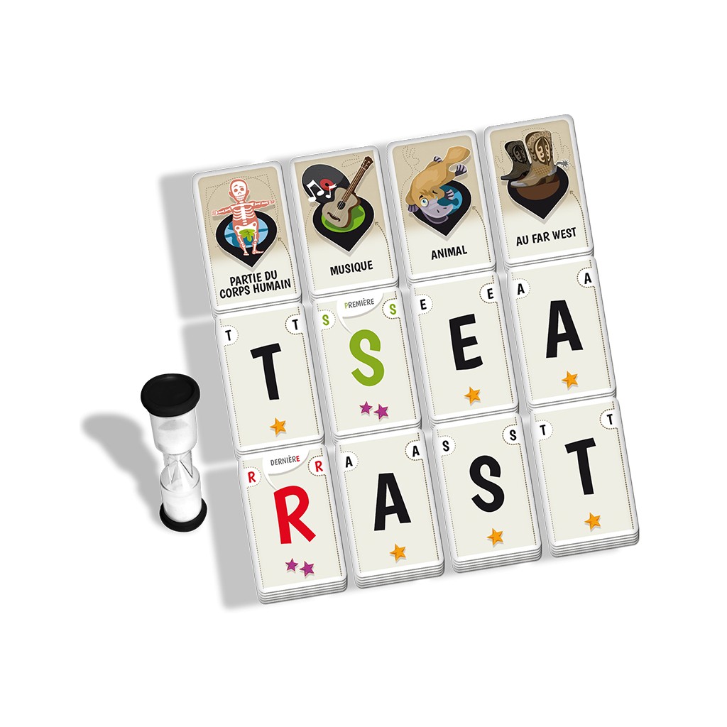 4 thèmes, 8 lettres sur la table (2 par thème) et 3 dans la main. Sur la table ce sont des tas de 5 qui vous attendent. Quand trois des thèmes sont épuisés, la partie s’achève.