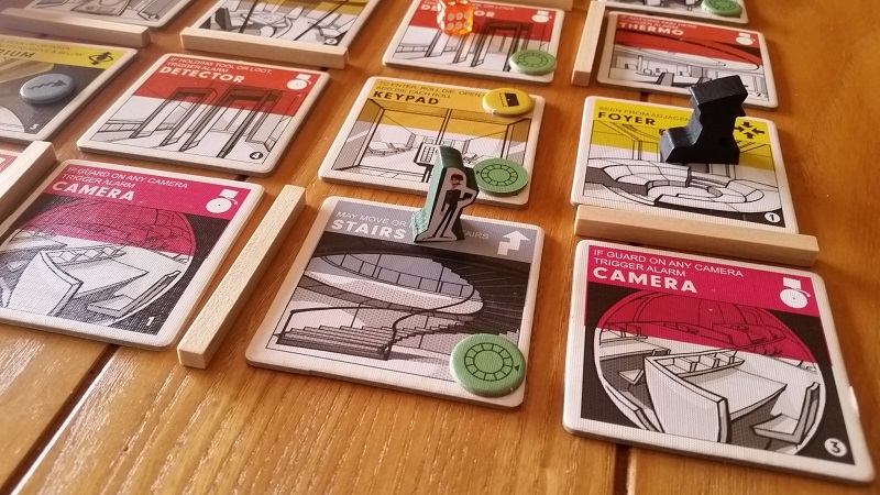 Lorsqu’un garde traverse notre case actuelle, nous perdons un jeton de vol (l’équivalant de nos points de vie) et la partie se termine prématurément si nous perdons notre dernier point. A l’inverse, la partie est gagnée si nous avons réussi à nous échapper en montant sur le toit de l’immeuble après avoir ouvert les coffres de chaque étages. Et là c’est champagne et gogo danseurs(euses) selon les goûts !