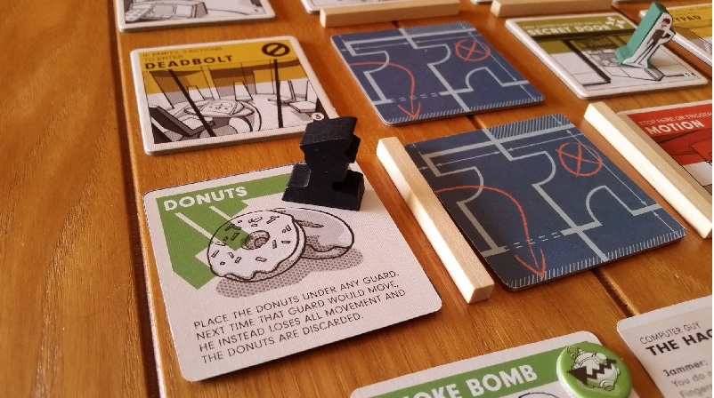 Pendant notre tour de jeu nous avons 4 points d’actions à utiliser parmi les possibilités suivantes : Découvrir une case adjacente orthogonalement, avancer d’une case, traverser une case (au risque de déclencher une alarme), hacker les systèmes de sécurité, gagner des dés pour trouver la combinaison du coffre-fort, tenter d’ouvrir le coffre-fort de notre étage actuel, utiliser les éventuels objets possédés. Dans le cas où une ou deux actions seulement sont réalisées, on pioche une carte Événement. Enfin, on termine notre tour par l’activation du garde de notre étage dont le déplacement dépend de son niveau d’alerte actuel symbolisé sur le plateau par un dé vers lequel il se déplace (ex : « face 3 » = il bouge de 3 cases). Lorsqu’il atteint sa destination/la case du dé, on lui pioche une nouvelle destination sur laquelle on place le dé et il avancera sur le chemin le plus direct ou dans le sens des aiguilles d’une montre en cas d’égalité sur le nombre de salles parcourues.