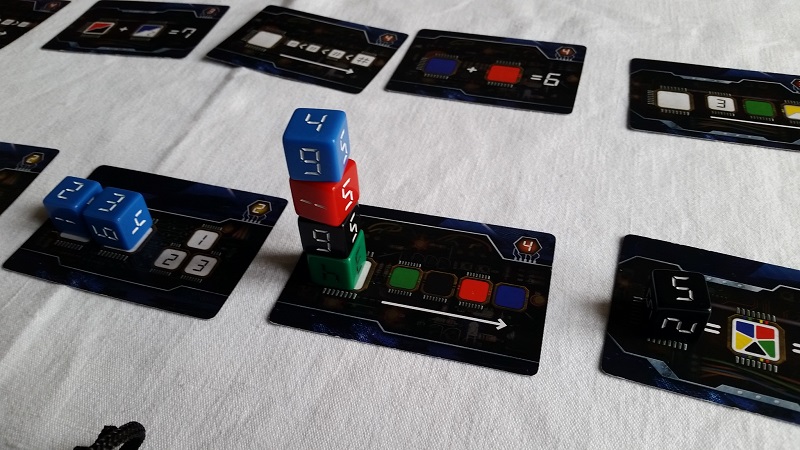 Lors d’un tour de jeu en solo, on pioche 3 dés dans le sac et on essaye de les placer sur une ou plusieurs des 4 cartes Bombes devant nous. L’avantage c’est que nous pouvons jouer 2 dés sur une même carte (combo!). Lorsque nos trois dés sont positionnés on en reprioche 3 et on recommence. Donc les tours durent quelques secondes à peine. Si on se trouve dans l’impossibilité de poser un ou plusieurs dés, on le rejette pour immédiatement puis on défausse un dé de la même valeur ou de la même couleur qui retourne dans le sac avec les autres. Argh